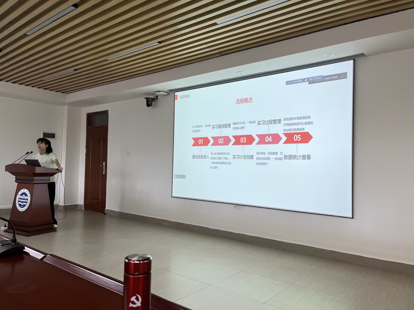 此后蒙经理开展实践教学管理系统培训,主要围绕“基础信息录入”、“实习基地管理”、“实习计划创建”、“实习过程管理”、“数据统计查看”五大板块进行了细致的讲解和现场演示,旨意于让大家更直观地认识和学习系统,以便更快地把系统运用起来。