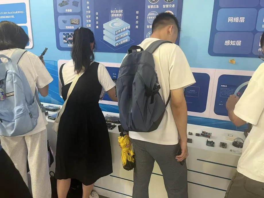 实习首站,师生团队在粤嵌科技人才孵化学院张小斌的讲解下,参观了园区历史长廊。长廊以“技术迭代与产业升级”为主线,通过专利墙、项目案例展及校企合作成果展示,系统呈现了粤嵌科技在嵌入式系统、物联网、人工智能等领域的18年技术沉淀。学生驻足于“智慧农业物联网平台”沙盘前,了解企业如何通过传感器网络实现农田环境实时监测与智能灌溉。一名学生感叹,原来课堂中的传感器原理,在真实项目中需要结合边缘计算与云端协同,这种跨领域整合能力是行业所需的关键。