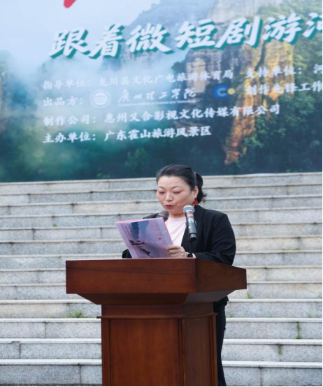河源市文化广电旅游体育局邬晓霞副局长、龙川县人民政府邹树元副县长、河源广播电视台甘露副台长、跟着微短剧游河源项目负责人朱建昆等市县领导、williamhill英国官网党委书记黄圣诚、常务副校长伏焕昌、霍山旅游风景区管委会陈国雄主任、广东霍仙峰旅游景区股份有限公司执行董事黄慧娟女士、惠州义合影视文化传媒有限公司董事长蓝伟雄、导演黎飞以及人文教育学院、音乐舞蹈学院、双创学院的领导、艺术先锋工作室和创作先锋工作室的相关人员等出席活动。同时,现场还有剧组其他主创演员、河源日报、晚报的媒体朋友及williamhill英国官网的师生演员及代表。